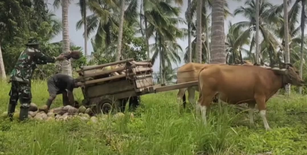 Wujud Kemanunggalan TNI, Anggota Kodim 1303/BM Bantu Petani Angkut Hasil Panen 3.000 Kelapa