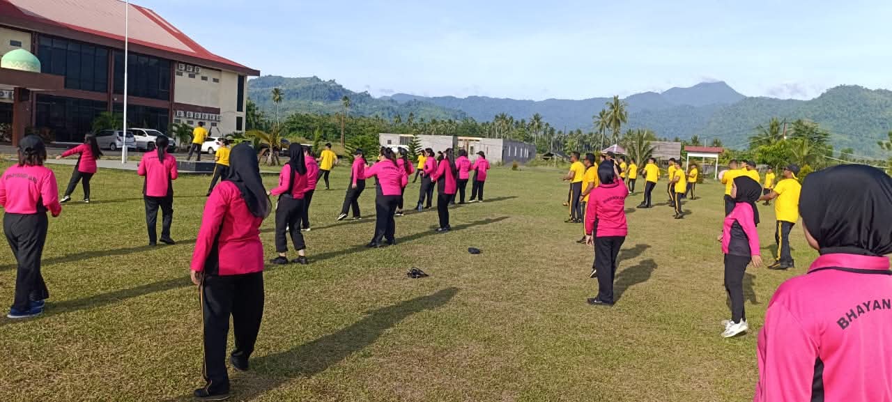 Kapolres, jajaran personel, dan ibu-ibu Bhayangkari tampak antusias mengikuti gerakan instruktur dengan penuh semangat. Suasana kebersamaan dan kekompakan terlihat jelas menyelimuti seluruh peserta yang hadir.