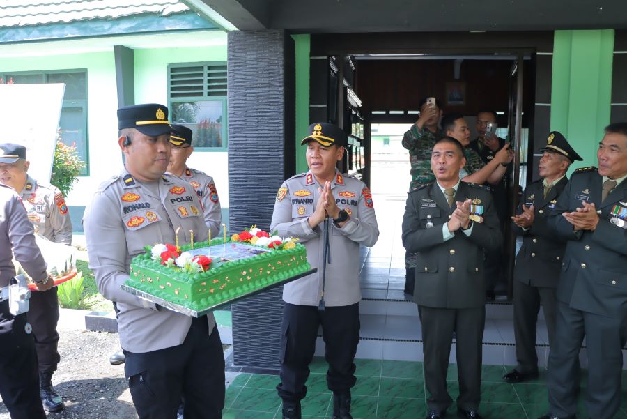 KOTAMOBAGU – Kapolres Kotamobagu AKBP Irwanto, SIK,MH beri kejutan di Hari Ulang Tahun (HUT) TNI ke-80 di Markas Kodim (Makodim) 1303/Bolmong berupa tumpeng dan kue ulang tahun, Minggu (05/10/2025).